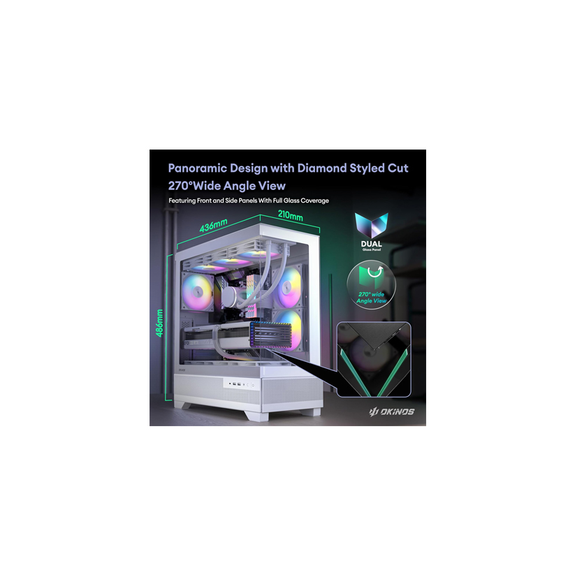 • 【Item Dimension & Motherboard Support】436mm * 210mm * 486mm (D * W * H);Compatible with ATX / MATX / ITX motherboards; 【Panoramic Design with 270°Wide Angle View】The 270°panoramic mid tower case features fully glass-covered front and side panels, providing a clear view of internal hardware. Diamond cut angles offer a transparent and aesthetically pleasing display, creating a unique visual effect;