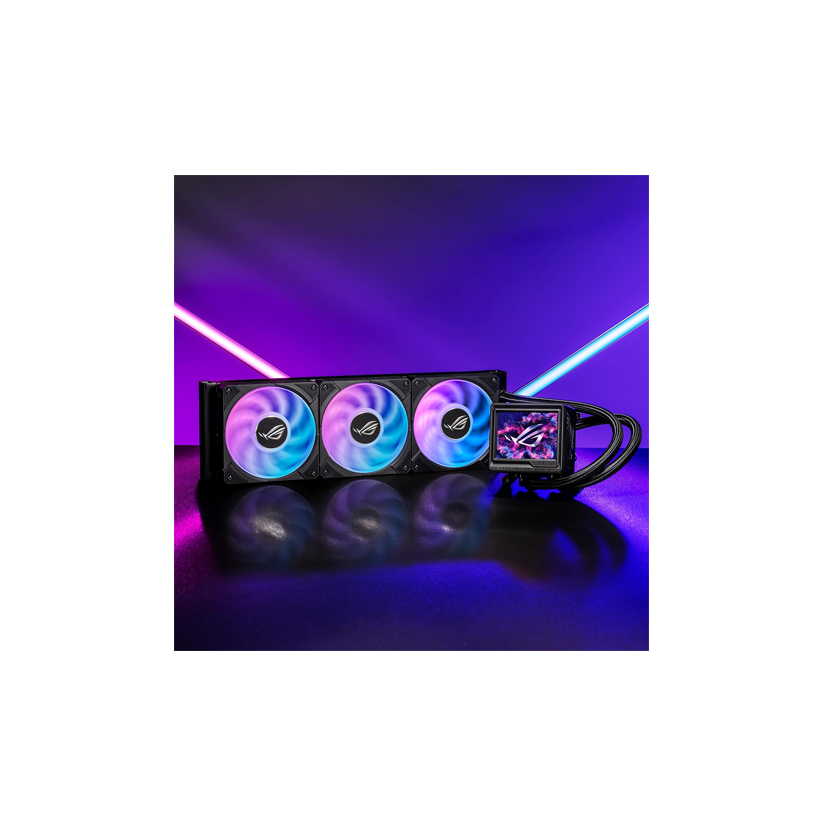 The latest Asetek Emma Gen8 V2 pump with a 3-phase motor delivers ultimate cooling performance, higher flow and lower impedance Thickened ARGB fans for high airflow and static pressure with noise optimization, quickly snapping together with special magnets to streamline installation 3.5" LCD screen increased to 640x480 for custom animated GIFs or live monitoring of clock frequency, voltage, temperature, fan speed or coolant flow Enhanced embedded fan in the pump housing to cool motherboard VRMs New software features: Control of pump and embedded fan speeds, AIDA64 with special ROG themes that creates a unique visual style