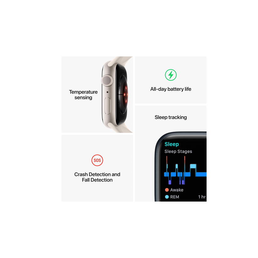 ADVANCED HEALTH FEATURES — Temperature sensing is a breakthrough feature that provides deep insights into women’s health. Keep an eye on your blood oxygen. Take an ECG anytime. Get notifications if you have an irregular rhythm. And see how much time you spent in REM, Core, or Deep sleep with Sleep Stages.